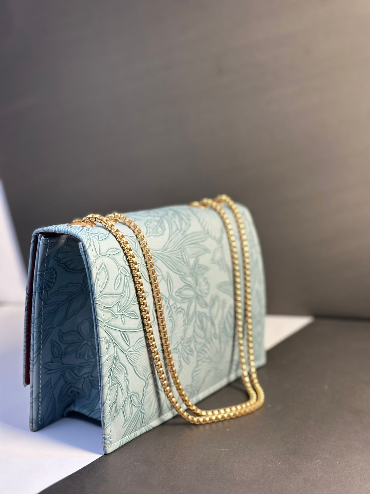 Where elegance blooms in every detail. TheBlue Petal Bagcaptures the beauty of nature through its embossed floral design and soothing pastel-blue tone. Accented with a sleek golden chain and metallic bar detail, this piece blends feminine charm with modern luxury.